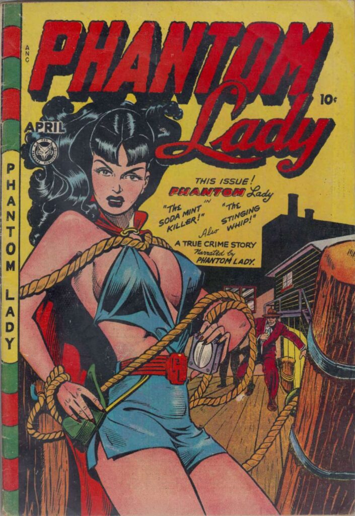 The image that changed American pop culture forever appeared on the cover of Phantom Lady #17 in April 1948: Baker’s illustration of the heroine bound to a post, chest thrust forward in her revealing blue costume. Dr. Fredric Wertham, a German-born psychiatrist who had previously done important work supporting racial integration, seized upon this single image for his 1954 book “Seduction of the Innocent.” His caption read: “Sexual stimulation by combining ‘headlights’ with the sadist’s dream of tying up a woman.”
